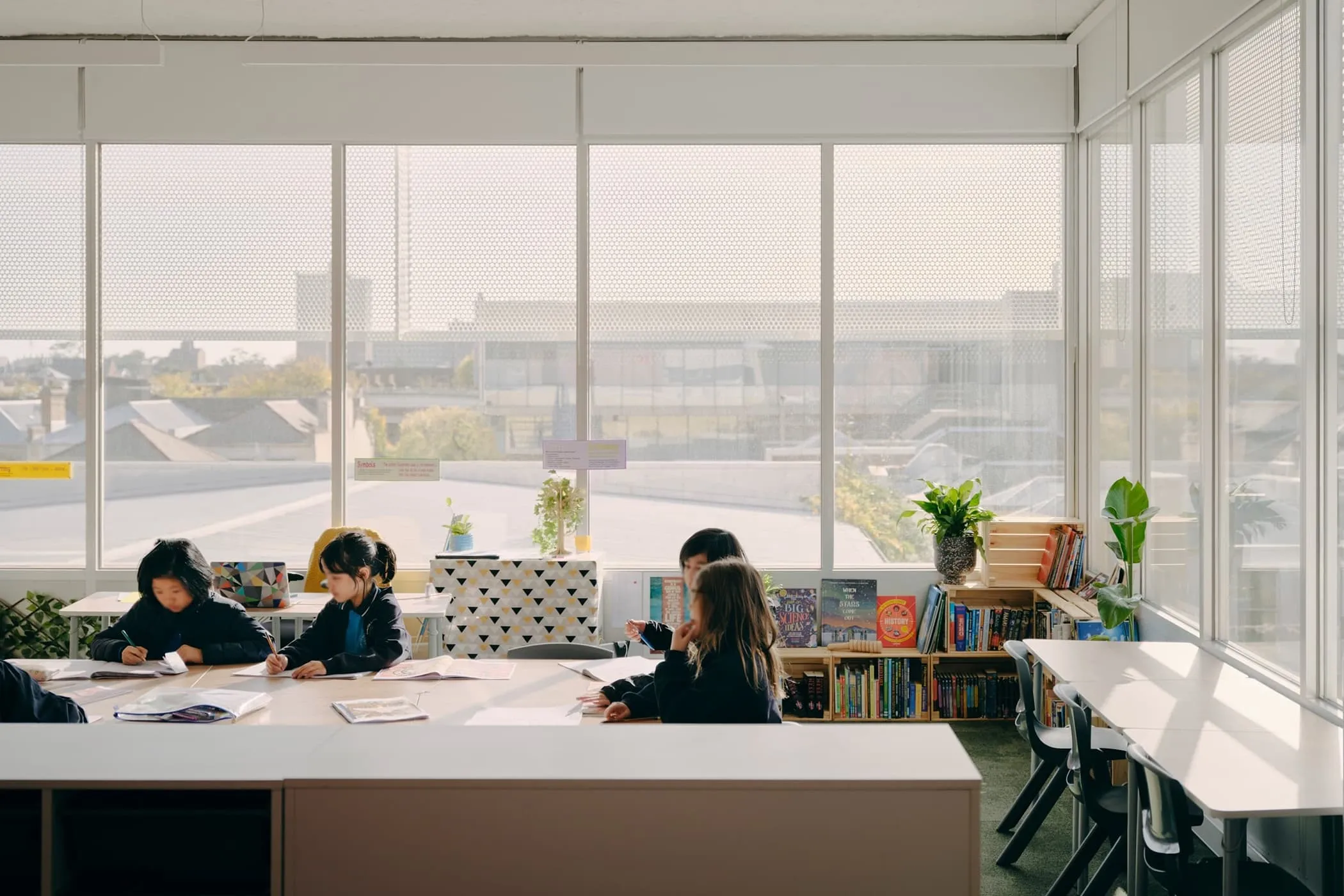 Six Degrees Architecture‘s Carlton Gardens Primary School delivered a four-storey, 23-classroom vertical expansion on the heritage Rathdowne Street campus — a $12 million project that earned a 2023 AIA Victorian Architecture Awards Commendation. NOORI worked with builder CCB to install the full classroom and corridor window furnishings programme, specifying fabrics that hold up to primary-school traffic and light control that respects Six Degrees’ careful daylight strategy. Shaded by NOORI.